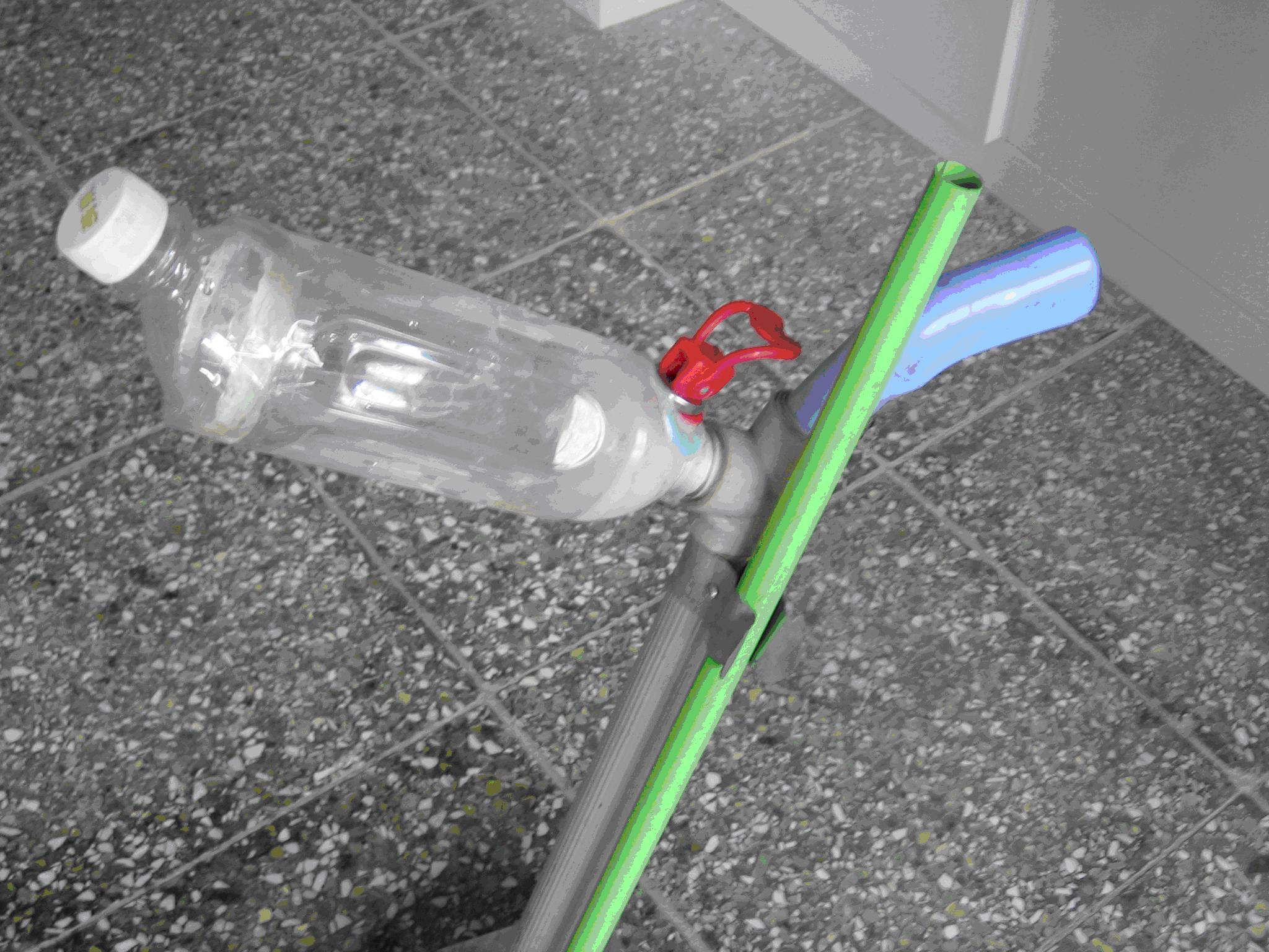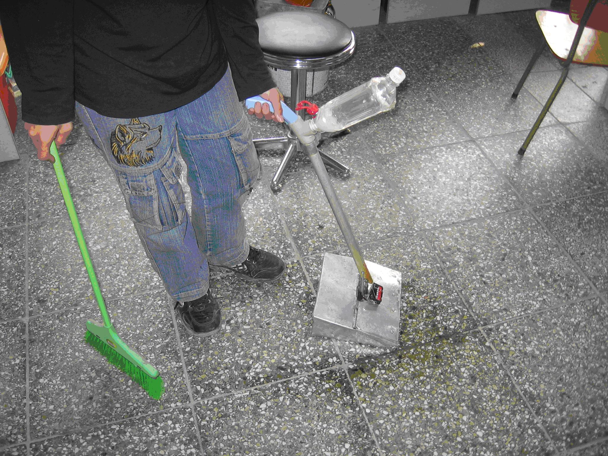 通常用普通带长把笤帚簸箕扫地,经常出现扬尘和垃圾从簸箕里掉出的现象,而其在犄角的地方有障碍物时地面很黑,不容易看到地面上的脏东西。为了克服这些缺点,特别设计了一个能喷水、又有能随意开关的垃圾盒,避免尘土飞扬,又能收集垃圾,在黑暗角落照明的簸箕。 多功能簸箕: 该项目是对普通白铁长把笤帚簸箕的改进,增加了一些创新点 1、盖子:簸箕盖子分前后两部分。后部与下边的簸箕固定在一起,前部分可活动,二者用合页结构连接,可以开关。活动部分是两层,内装自制的喷水口和连接水瓶与喷水口的朔料管。活动盖子上立着一个与前后盖各成一定角度的长把。 2、长把:①长把管子下端固定在活动盖子上的后部,距下端2厘米处分成上下两段,上段可前后活动,向后时控制在一定的位置上,斜立,开启前盖。②长把的上端设计一个三通,下口接长把,上口接弧形的手握的地方,另一口与长把内朔料管子铸在一起,成螺纹状,拧上水瓶。 3、喷水:①装水瓶子是矿泉水瓶切掉瓶底,铸上饮水机的开关和一个矿泉水瓶口,作为开关及把瓶子拧在长把上。②水瓶上口改成上湾的弧形,用来灌水。 4、照明灯:在长把的底部放一组电池,在长把的上部人手扶的地方放一个开关,在长把底部放一组了LED灯,在看不清的地方可以打开灯进行照明,方便进行清扫。 6、在垃圾收集盒的上方放一个垃圾桶,这样可以将日常垃圾放入桶中,这样就节约了空间。