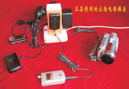 随着科学技术的不断提高,电子产品的使用越来越多,如每个家庭都有数码相机、摄象机、多个手机等。这些电子产品都是用专用电池供电供电,一旦电能耗尽就要及时给电池充电。大多数充电器都与电源插头直接连接,因带插头的充电器体积大,占据的面积也大。如果一个5孔平面电源插板,插上2个充电器就没位置了,为此我萌发了此项发明。 该作品主要用了长方体的四个立面,插接充电器时互不干扰,使每个插孔都得到利用,充分利用空间,节约了资源。作品制作完成后,经过试用性能好,安全可靠(因充电器功率小),也适用于其他电器的插接。