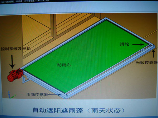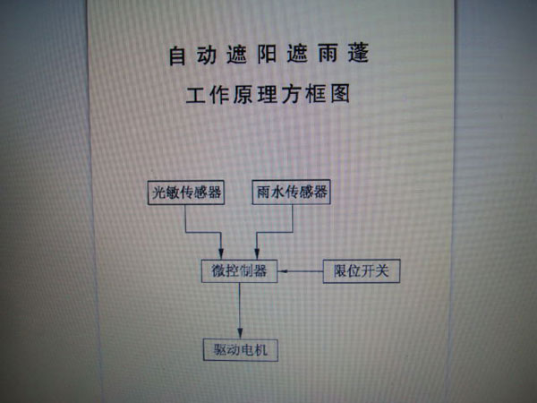 本作品主要由控制系统、传感器、驱动电机、卷筒,防水篷布、牵引带、滑轮,同步轮,金属框架,限位开关等构成。 当控制系统经雨滴传感器感受到落雨时,就向驱动电机发出运转指令,让其转动,从而带动卷筒轴转动,卷筒轴则带动固定在套装轴上的卷筒(卷筒上卷有防水篷布)、同步轮转动,同步轮则通过牵引带带动连动杆做水平方向的移动,使得篷布伸展开来,起到遮水作用,当连动杆平移到适当位置,则触碰到限位开关,发出信号给控制系统,控制系统则让驱动电机停止工作。当控制系统经光敏传感器感受到阳光照射时,就向驱动电机发出反向运转指令,让其转动,从而带动卷筒轴及卷筒反向转动使得展开的防水篷布被卷回来,让被晒衣物重见阳光,当连动杆平移到适当位置,触碰到限位开关,其发出信号给控制系统,控制系统则发出控制指令给驱动电机,让其停止工作。