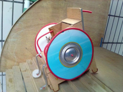 本作品采用摇杆四连杆原理,往复不断地循环运动向前。我们在提出了正确的设计思路后,通过实体店、互联网各种渠道获取所需的材料,然后在家长和老师的帮助下制作成品,制作完毕后发现没有测试工具,于是做出了一个木制底座,来测试该"会爬楼梯的轮椅"的性能。 我们尝试了许多方法之后,发现了诸多不足,于是。我们用一些卡纸片,成品的发动机马达,还有一个纸杯做缓震器,下面有两个木制底座,运用摇杆四连杆的原理不断地往复循环运动向前,前面有两个滚轮辅助运动及转向。 经过诸多改良,最终制成成品。