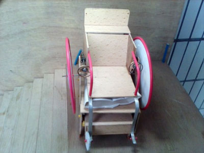 广州亚残运期间,我们学校组织学生创造发明,有人想制造一种便于残疾人使用的轮椅给有需要的人们使用。我们经常会看到一些坐轮椅的人士,在上下楼梯的时候很不方便,也会发现几乎没有人的轮椅是可以爬楼梯的。但是有些同学通过互联网发现已经有人发明出了一种可以攀爬楼梯的轮椅,为什么没有被推广呢?这些轮椅运动方式与我们完全不同,有些是履带式,有的是星轮式,还有的是导轨式。 我们采用了另外一种特别的形式。根据仿生学模仿动物行走在楼梯上的状态,在制作轮椅的过程中采用了曲柄摇杆四连杆的原理,成功制造了样机模型。不仅可以在楼梯上爬行,还可以在地面上爬行。更重要的是,我们发现这种"会爬楼梯的轮椅"还可以当成一种儿童玩具去搭售或者单独售卖。市场上目前没有此类产品。而且制作成本成本较之其他互联网上所介绍的产品低廉许多,舒适性也相当不错,能够在一些角度比较大的斜坡上攀爬。 我们这种新型轮椅,采用了双底盘的结构,通过往复的循环运动不断向前,对地面的适应力极强。如果可以投入市面大批量生产,可以造福老年人。