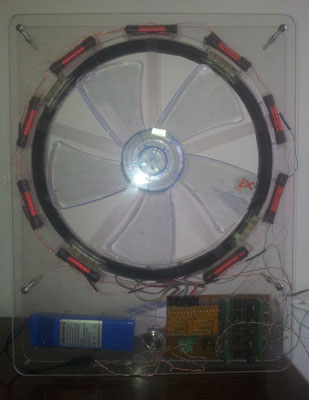 传统电风扇一般采用交流电机,能效低,体积大。为了降低功耗,节约能源,本项目设计并制作了一种新型风扇:基于光电传感控制的轮式平板风扇。平板风扇是一种轻巧精致的家用电扇,利用当时刚学到奥斯特"电生磁"和法拉第"磁生电"的基本原理,既然电能产生磁场,磁场能推动磁铁,那么将电磁体与永磁体设置在扇叶边缘,所产生的扭矩肯定比位于中心的电机要强,这样可以去掉中心电机,做出来的电扇厚度基本上就是扇叶的厚度,这样电风扇就可以变得很薄了。轮式平板风扇具有更高的能效比,并突破了常规风扇设计,扇叶中心没有电机,采用扇叶外轮磁力驱动,扇体超薄,具有轻巧节能特点。