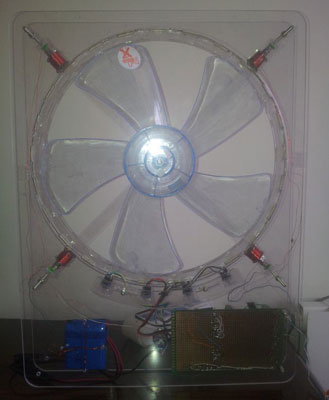 本项目主要的创新点是设计实现了一种基于光电传感的轮式平板风扇,它的扇叶中心没有电机,具有超薄特性,扇体厚度可以做到50毫米。 为了实现这种超薄、节电、使用方便的新型风扇,轮式平板风扇的整体设计与实现过程中包括扇轮设计与实现、风扇机座设计与实现、永磁铁布局设计、电磁线圈设计与布局、电磁铁驱动电路设计、磁动力系统设计、风扇启动设计及风扇直流后备电池系统设计与实现等,其关键是磁动力驱动系统设计、风扇启动系统设计以及电磁铁驱动电路设计。 轮式平板风扇驱动扇叶的关键是确定扇叶边缘磁铁位置及启动相应电磁铁,受到LEGO机器人的启发,可以采用光电传感器方式,模拟机器人走黑线原理,在扇叶外围扇环上用黑色涂满,并用反光标记标出永磁铁位置,当光感检测到反光标记时启动相应的电磁铁,使扇叶按序受力,顺时针旋转。在制作、测试和完成原型样机的基础上,总结了轮式风扇的构成规律,给出了6种典型构成方案。对轮式平板电扇的风量及能效进行了测试,并与常规风扇进行了比较与性能分析。测试实验初步证明,轮式平板风扇具有更高的能效比,并突破了常规风扇设计,具有轻巧节能特点。