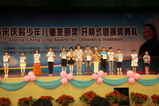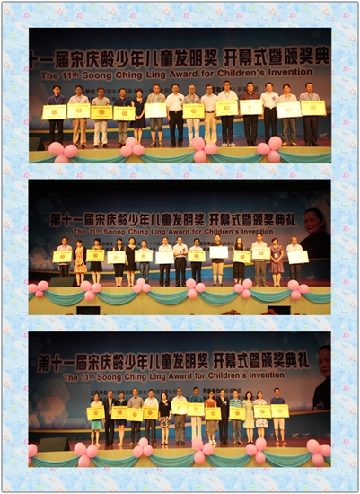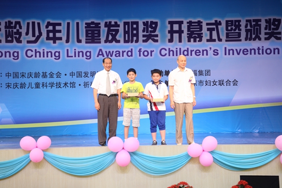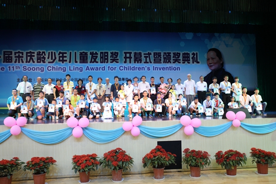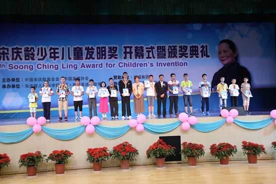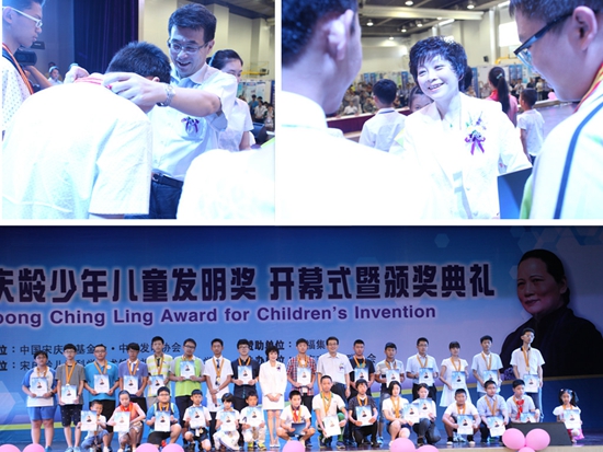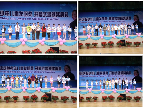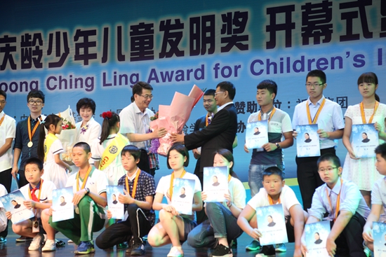 与会嘉宾为"宋庆龄少年儿童发明奖科技示范基地"获奖者颁奖