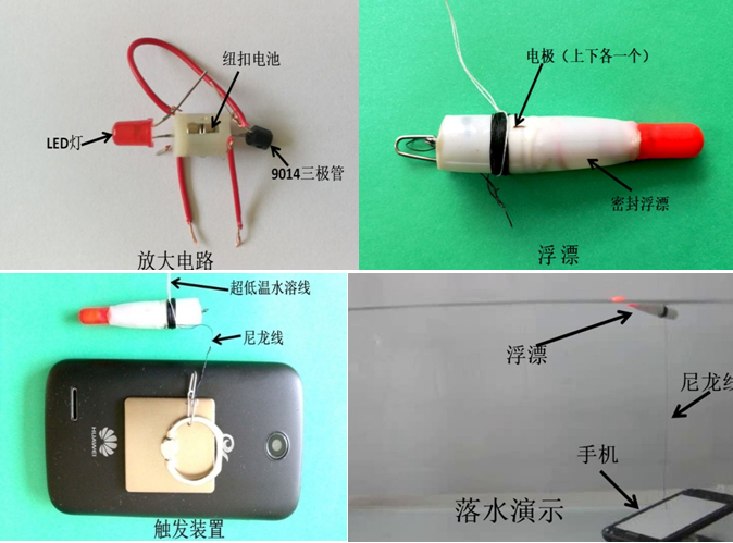 由三部分组成: 一、电路:由一个9014型三极管、两块纽扣电池、一个LED灯组成放大电路。 二、浮漂:将电路放在具有浮力的柱形塑料内密封,柱形塑料外面留出两个电极; 三、触发装置:浮漂外面有规律的缠绕尼龙线,并用新材料超低温水溶线将尼龙线捆扎起来,尼龙线的一段连接装置,一端连接手机。