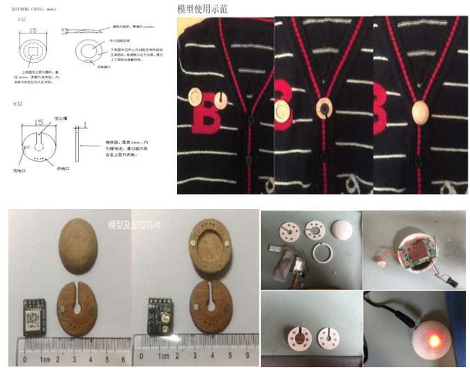 目前制作了木制的演示模型和3D打印的放大的有功能的模型,特殊的设计使定位仪不易脱落且安装方便,定位仪就像一颗伪装的纽扣一样,不易被发现和移除,具有极佳的隐蔽性和安全性,并且双卫星系统互补的优势能确保定位功能的有效性,自己通过C++语言编制app程序,方便修改和升级完善。如果将来条件成熟,还能将北斗卫星的短报文功能运用到定位仪上,预置求救信号,使家长能即时收到儿童的报警信号和位置。