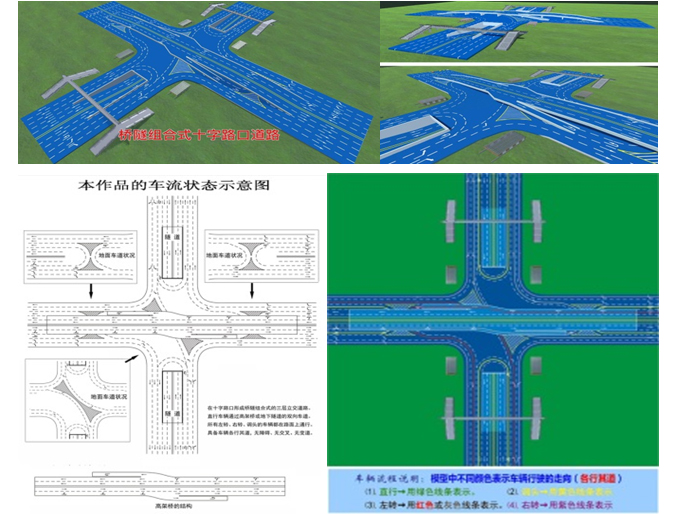 本作品的结构包括横向高架桥和纵向地下隧道,以及人行天桥和人行地下通道。所述横向高架桥为双向直行车道,架设横跨十字路口,并在桥面位于十字路口处的两侧分别设有下桥叉道,用于在桥面车道上行驶的车辆下行至桥下路面上左转向;所述纵向地下隧道为双向直行车道,下穿纵跨十字路口;所述人行天桥架设于纵向车道上方,并横跨车道的路面;所述人行地下通道设置于地下隧道车道的两侧,并在地面设有4个进出口。