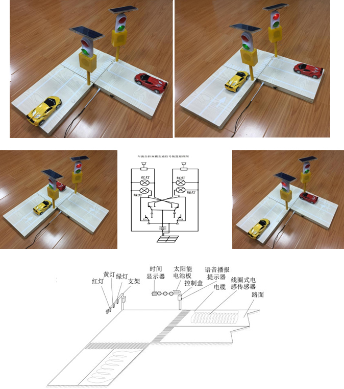 在模拟乡村路口的每个方向的车道上安装二级电感式传感器,第一级触发延时继电器(可延时0—120秒),第二级触发开关量循环继电器。太阳能电池板,连接储电装置,储电装置的正极连接到第一级电感传感器触发的触发端与第二级循环继电器的公共端,第二级循环继电器的常闭端分别连接到异向车道的绿灯与第一级延时继电器的公共端,第二级循环继电器的常开端分别连接到异向车道的红灯与语音提示装置。本项目采用太阳能发电装置供电。