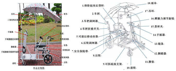 四轮车,车身大面积底盘。车上配有:①自制的吊环、脚踏器、手摇器、仰卧起坐器。②三角结构支架挂着吊环及插着雨伞。③带链条的手摇器脚踏连动装置、及手摇器脚踏器负载调节装置。④坐垫在固定轨道上,可前移后移。⑤双重刹闸:车把刹闸器、后轮刹闸器。⑥隐蔽的坐便器、安全带、水杯架等配件。⑦车把可折叠、整车可折叠与拆装。