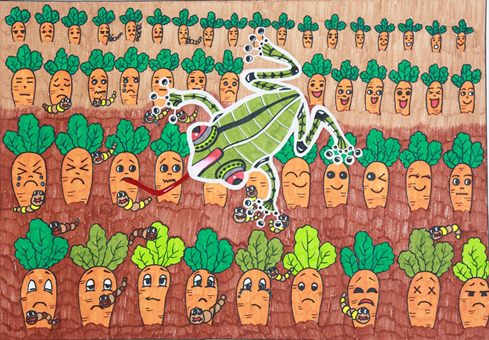 作品说明:每天,害虫都会来田里偷吃疏菜、瓜果,农民伯伯为了提高产量,起早贪黑地背着杀虫农药到田里除虫,累坏身体不说,杀虫农药还残留在蔬菜、瓜果上,吃了对我们身体也有伤害,怎么办呢?我想到了好办法,我为他们发明了“超能青蛙机器人”,超能青蛙机器人的足下有电流磁场,只要一触碰到,所有的害虫就没办法存活下来。就这样,在超能青蛙机器人的巡视下,我们都能吃上无公害的蔬菜、瓜果,同时也减轻了农民伯伯的负担,不用再花时间、精力来打农药,蔬菜、瓜果的产量也大大提高了!
