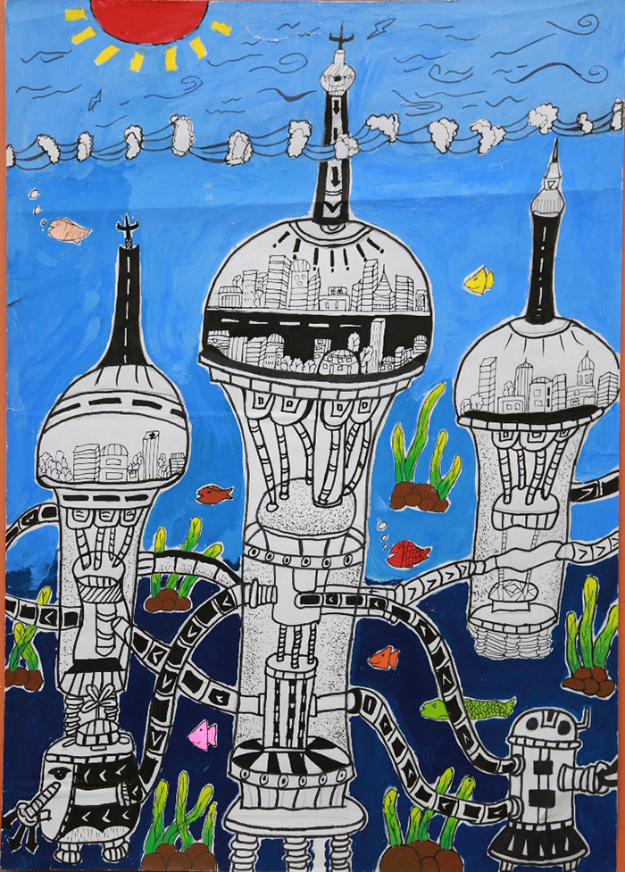 作品说明:我的这幅画的是海底环保水晶城,我们漫游在海底时,总会被海底美妙无比的珊瑚小鱼和水族生物所吸引。在未来有趣的海底会成为我们的第二家园。但是由于人们越来越不注意保护环境,有去美丽的海底世界已经变成了一个垃圾堆。海底环保水晶城它能够帮助人们把海底将产生的垃圾进行清理。海底城的形状类似电视塔,人们生活在塔顶,而清理装置可以将海底的垃圾收入自己的肚中,可以通过电和不同的机械将这些垃圾变废为宝。每底环保水晶城可以让海底变成美丽的世界。有趣的海底就会恢复往日的美丽。
