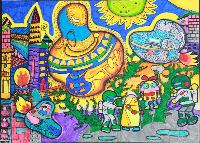 作品说明:人类发明了绿色的太阳,绿色的太阳放射出的能量可以通过“绿色能量转换器”转化成一种特殊的生物能量,这种特殊的能量可以使植物生长出任何人类需要的工业产品,比如:机器人、高楼大厦、飞机,这样人类就可以在得到工业产品的同时更好地保护自然环境了。