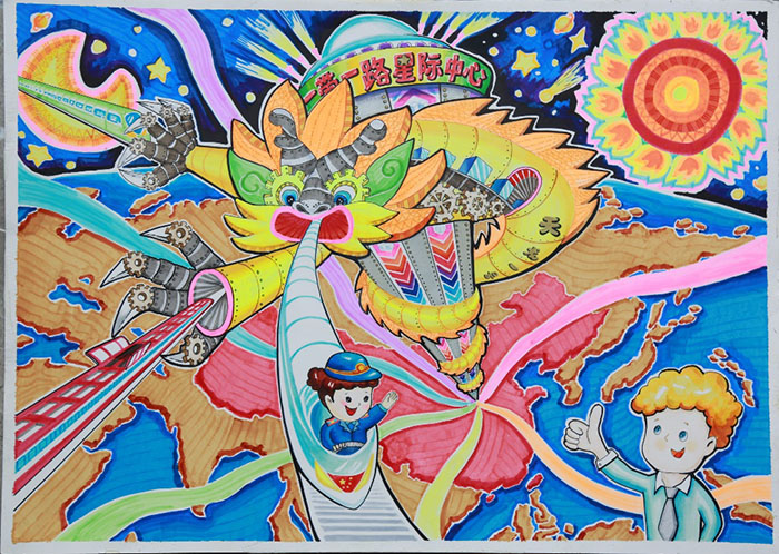 作品说明:习主席提出的“一带一路”是在我国古代丝绸之路的基础上发展创新的,让整个世界的经济、文化、互通、互惠、互利。我不由得想未来的“一带一路”会发展成什么样子呢?肯定已经发展到太空域了,看,一带一路星际中心从地面直上太空,避免了陆上运输的拥赌,和海运受天气影响,比飞机运箝能加载更多的货物,这么高怎样运输呢?别担心,有我们中国自行研制的“天龙”系列运载设备呢!(龙是中国的图腾与象征),它能运载大量的货物快速到达。星际列车实现各国及宇宙间的互联互通,不但能快速到达世界各地,还能与外太空对接,让全世界与字宙共赢。