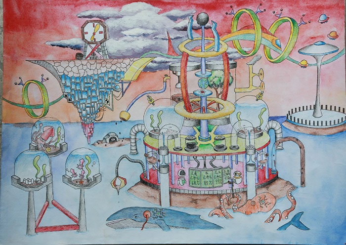 作品说明:在未来世界,地球的水污染、空气污染和土地不足问题严重,虽然人类可以靠建先进的住所来解决土地不足问题,但动物不能,甚至居住在海洋的动物需要洁净的水来生存。这样我