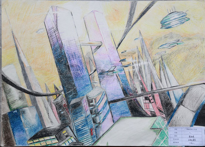 作品说明:在许多年以后,城市里会有更加雄伟壮丽的大厦与形态不同的建筑。在大楼之间会有连接通道,能促进人与人之间的日常交流。科技的飞速进使节能飞船成为了人们的日常交通工具.在夜幕即将到来之际,楼里亮起的灯恍若陨落于人间的星辰一般点缀着城市。