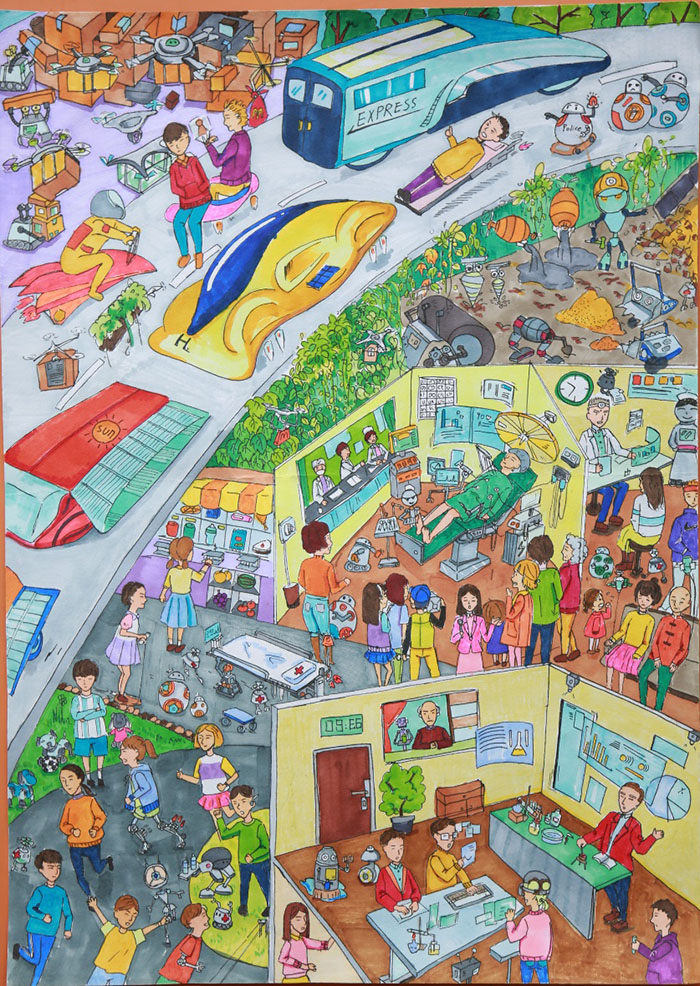 作品说明:科技改变着我们的生活,我们对它亦寄予了去解决更多问题、创造更美好生活的期望。我描绘的未来生活是这样的。一、教育领域,先进的教育技术广泛用于课堂,通过系统识别,多维图像或视频等便会形象地呈现在同学们面前,使立体几何和化学等学科的学习变得soeasy;二、健康领域,智能机器人能时刻为我们提供个性化的保健服务、身体检查及手术操作;三、工程建设领域,机器人建筑队替代工人劳作,高效精准地完成工程;四、交通领域,智能化和个性化设计的清洁能源汽车按各自方式有序行驶,畅行的立体交通已不再是神话。