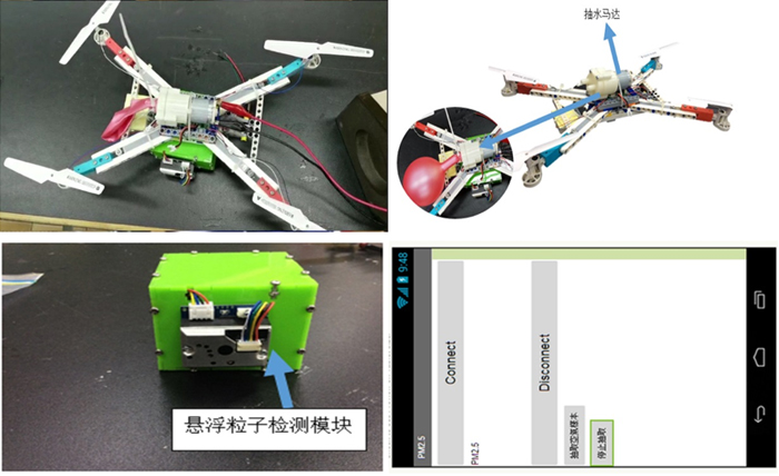 为了让我们的无人机能够检测空气的质量,在机架上方,我们安装了Arduino开发板、PM2.5空气检测模块,配合我们自设的手机应用程序,可以实时观察到上方空气的PM2.5的数值;另外,为了让我们更清晰了解上方空气的悬浮粒子,我们安装了小型抽水马达及气球,用来收集空气样本。