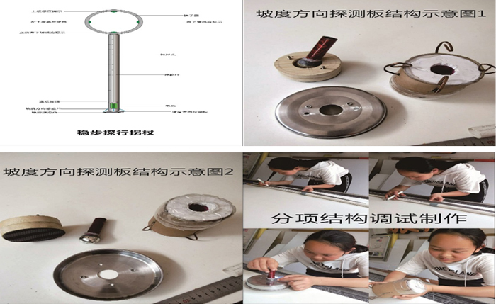 “稳步探行拐杖”能通过拐杖上不同部位的声音或振动感应提示判断坡道的类型(有没有障碍物,前方是上下坡或左右坡),让眼睛不方便的人平安出行,方便散步,并能估量障碍物大小,也能提示旁人做好礼让,减轻陪护人员工作量。