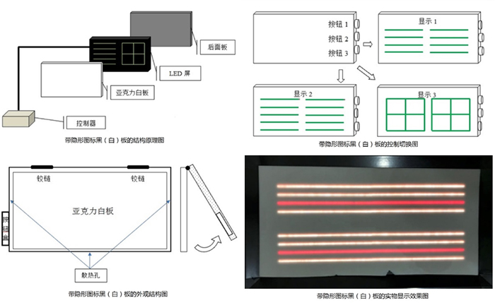 完成模型,测试预设的每一种图案:都能在白板上清晰、准确地显示,每一个按键按下,对应的图案点亮。测试结果证明:本带隐形图标黑(白)板,可以顺利完成“多重显示/隐藏预设图标模板”的任务,总体使用功能良好。