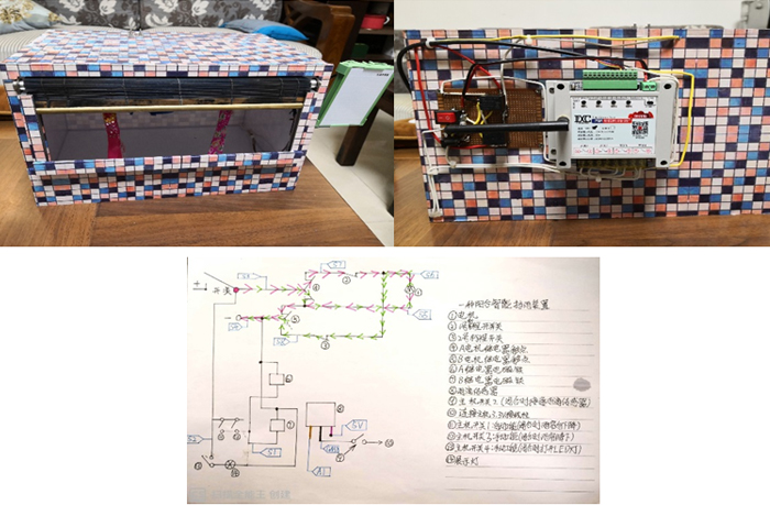本作品主要特征是:利用亚克力板制作的长方体阳台模型,长方体侧面放置雨滴传感器,背面装置了四路物联网控制器及电路板。作品外表利用马赛克纸粘贴作装饰。