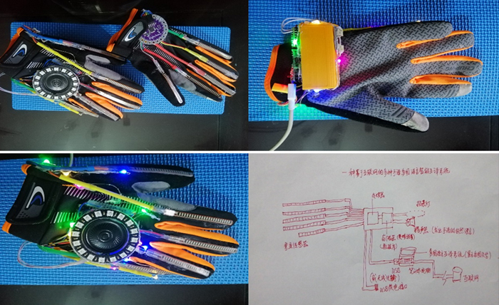 1、弯度传感器部分及线路;2、处理器、存储器 部分;3、信号灯、喇叭、蓝牙信息输出部分;5、手套、USB辅助架构部分;6、计算机网络多种语言翻译软件部分