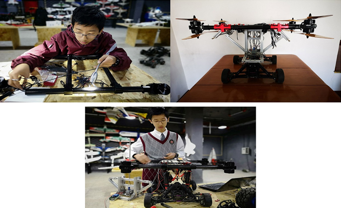 制作便携式陆空两用载人飞行器。首先,选择承重能力在35Kg以上的,质量较轻的,电动越野车模型,并对其减震进行改装且在其基础上进行大量的不改变结构强度的减重。然后,选用质量较轻的航空铝材和航空模型用的碳纤维杆,高强度3D打印材料,并用步进电机,丝杆及曲柄滑块机构组成旋翼变形结构,实现旋翼机转汽车的变形。再利用圆形碳杆,正反木(碳纤维)桨,大电流电子调速器,盘式电机,制作完成了安全性高的共轴双桨的大载重旋翼机结构。通过两块12,000毫安时锂离子电池并联作为动力源。最后,采用DJI A3 PRO飞控,令飞行安全可靠。配合双色指示灯,夜间飞行更安全。搭载FPV摄像头,5.8GHZ视频实时传输。