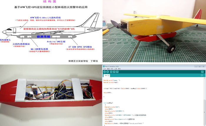 2、GPS/短信模块+arduino主控、火焰传感器、烟雾传感器与航模飞机结合,应用于小型林场防火预警,巡查速度快,定位准确,反馈及时。