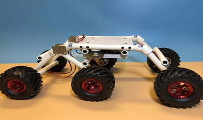 实验时,六驱车可以原地旋转或转弯,前行或后退,爬坡实验前轮很稳地爬上3厘米高的木块,由于前轮的三角活动结构,一边车轮在木块上,另一边车轮在地面,继续开启摇控开关,六驱车轻松越过木块平稳行驶。