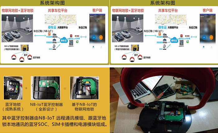 该系统由一个全新的具有远程控制功能的NB-IoT(窄带-物联网)物联网地锁、该物联网地锁周边的几个成熟蓝牙地锁、共享车位交易平台、车位出租方APP和车位订购方微信小程序组成。