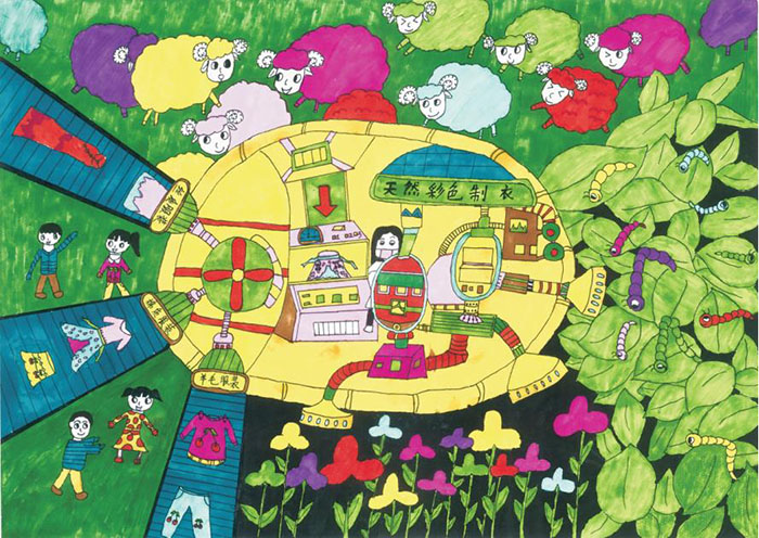 作品说明:我国服装中含有甲醛是不争的事实。这是因为生产企业在面料生产的过程中,通常都会加入大量含甲醛染色剂和树脂整理剂。而甲醛会长期缓慢释放出来,引起食欲减退、体重减轻、衰弱、失眠等症状。如果未来的科学家能培育出长着彩色羊毛的羊,能抽出彩色丝的蚕,能抽出彩色棉线的棉花,那么人们不用给布料染色就可以直接加工出彩色的衣服。纯天然、最环保。我们再也不用害怕衣服里面含有有害物质,也不用害怕因化工染织而造成的环境污染。