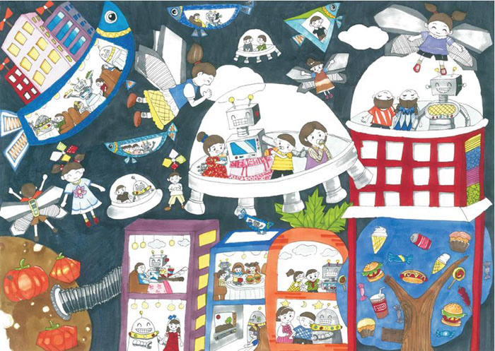 作品说明:在一次研学活动中,我看到太空种子种在陆地上,结出大的果子。我想太空种子一定比陆地上的植物种子有超能力。把它种在火星上一定会结出很多神奇的果实。在太空上建一所“大空美食城”,加工由火星上运输来的果实,那一定是太空独有的美味,吃了它会让我们的身体更强壮。“太空美食城”不光可以购买到美味的食品,同时还可以佩戴或者乘坐提供氧气又有感应功能的飞行器游览宇宙景观,还可以到小鱼飞船上的KTV、俱乐部等有趣的活动室,去听智能机器人讲解做食物的方法、太空种子的奥秘和宇宙的知识。