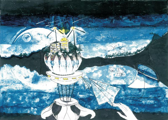 作品说明:在未来人们可以生活在悬浮在空中的城市,城市共三部分,在悬浮城市里有风车产生电能,底部可放置在水中,通过过滤管道将干净的水源输送到顶端人类生活的花瓣型储水器中,生产的垃圾运送到第二层进行分解并循环使用,让人们的生活环境更加美好。