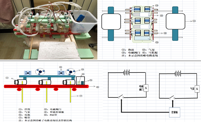 其中船体包含:气泵、浮筒,智能控制板、船体、储水装置。
