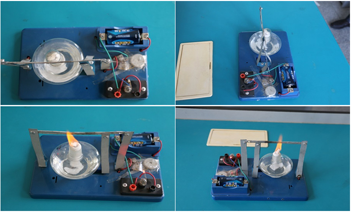 用一个铝制金属条条穿过两个 支架之间的缝隙 中,接着点燃酒精灯给金属条加热,如下图3所示。过一会儿 ,固体受热膨胀后 ,接通电路 , 固定台上的音乐响起并伴有闪烁 的灯光。当加热 停止时,固体受冷后收缩