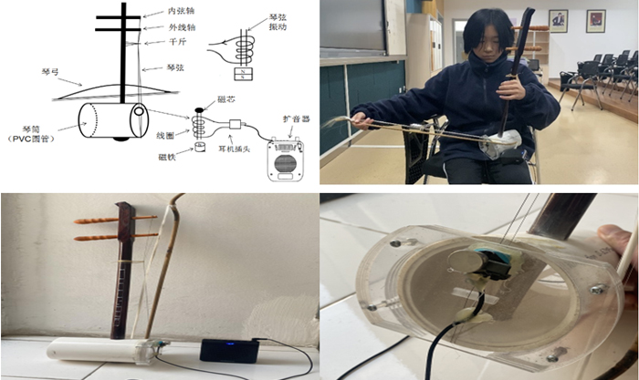 选定一种环保低耗的亚克力板来替代蛇皮制作二胡的蒙皮,采用尼龙绳替代马尾毛制作弓弦。为了使二胡的音质与传统蒙皮二胡的音质达到相同,我应用了物理课上学到的一种磁共振原理,采用线圈和磁铁及功放音箱实现二胡的发音功能。寻找材料,开始制作。制作完成后进行试拉,并邀请我二胡的辅导老师进行评价,受到了较好的评价。