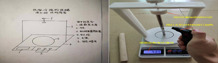 我们先将测试的材料放在电子秤上方,然后拧紧固定螺母将测试材料固定在电子秤上,打开电子秤。接下来用打火机加热测试材料,同时观察电子秤上的读数变化情况,然后不加热等温度下降过程中,继续观察电子秤读数的变化情况。