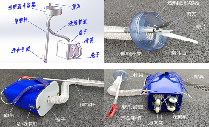 圆形容器,软质管道,背篓,轮子以及和剪刀伸缩杆这几种物体在平时生活中关联性较小,但我可以将他们进行结合为一体,为生活提供便利,并且能达到预期的效果。