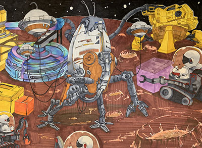 作品创意说明:2020年,我国将通过长征五号发射火星探测器,并通过一次发射实现“绕、落、巡”(火星环绕、着陆和巡视探测)三大任务,这在世界航天史上尚属首次。登陆火星使人类走向深空成为现实!太空中有着人类太多未了解的秘密,也有着数不清的财富!随着人类社会的发展,地球上已有且能实现广泛开采的资源正处在消耗日趋增长的阶段,而作为不可再生资源,矿产资源迟早会面临枯竭的现实。太空采矿也许就是未来的解决办法之一。