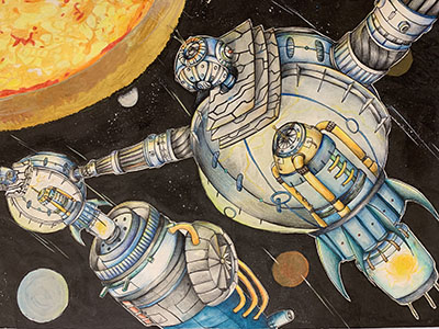 作品创意说明:在未来地球资源匮乏,人类开始发展科技,通过先进的科学技术将能源提取器放置大阳四周吸取能量,能量汇聚在能量罐中,收集满时,会有采集机器将能量罐收走,再安装空的能量罐。