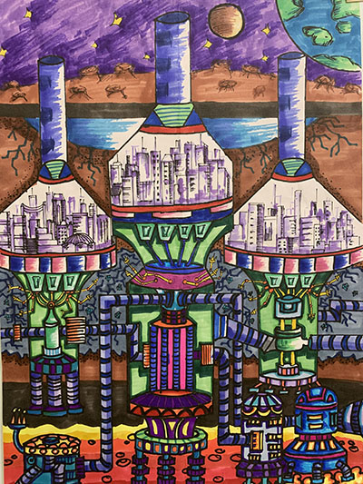 作品创意说明:当今环境问题是人类面临的大问题,大海被污染,能源被耗尽,人类生活的家园面临着危机。因此,我想要建造一个未来文明城市,该城市可以在任何星球工建造,帮助减轻地球母亲的压力。为了避免其他星球上大量的紫外线对人类生活的影响,城市建于星球内部,城市上方的三根柱子是空气转换机,能够制造与地球大气相同的空气;未来城市对电能的需求量很大,因此电能转化器将地下岩浆的能量转化为电能;未来城市的“超能爪子”可以自动探索并挖据岩层中的矿石,城市下方有垃圾处理机,可以将城市垃圾自动处理,埋入岩石层,逐渐转化为人们可以利用的矿石。