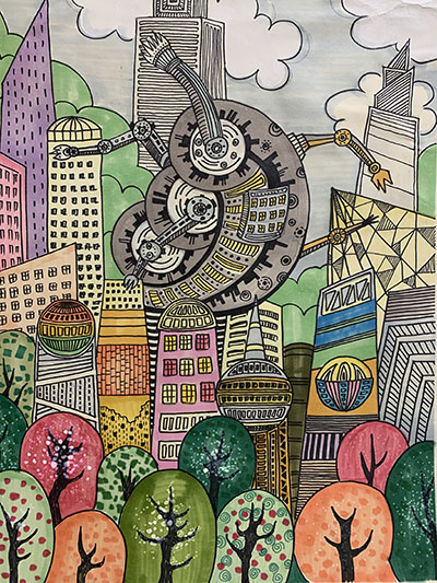 作品创意说明:时代在发展,城市在建设,一座座高楼巍然耸立,建筑外墙五彩缤纷,是城 市一道亮丽的风景线,但是历经风雨的建筑外墙,会褪色、脱皮等现象,影响美观。有了城市建筑美容机械臂就可以精准的给建筑外墙做个美容啦,城市建筑美 容机械臂会根据数据自动调整,只要15秒就能实现精准定位,它的功能有:精洗