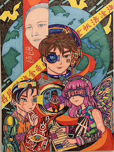 作品创意说明:随着科技的发展,全球已经进入了"全镜学习时代"。各种眼镜机器成为大家的新学习设备。中间的男生运用"远望"眼镜学习天文知识。左边的男生运用"全息影 像"的隐形眼镜来学习古汉语知识和古代服饰的设计等内容,女孩是运用"镜像视 频器"眼镜去感受音乐的魅力……"全镜"学习方式带来了新的活力。青少年学生 们秉承着"长风破浪会有时,直挂云帆济沧海"的信念,向先贤们学习,在知识的