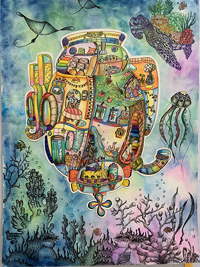 作品创意说明:地球土地供应越来越紧拙,经常要填海造地,各类经济活动带来空气和噪 音污染,气候走向两极,所以未来我希望生活在海里,不用为价格高昂土地而烦恼,有恒常的气候,有事静的环境,相当写意,这就是我的构想--未来的家。