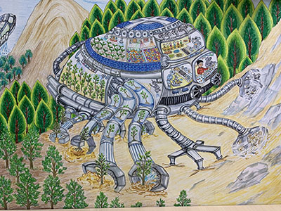 作品创意说明:我们国家有许多土山没有森林覆盖,我要发明一种植树机,能采集山上不同位置的土壤,并对土壤性质 进行分析,还可以根据土壤性质改良树种基因,培育出来的树苗不仅能够茁壮成长,而且在成长过程中,树根的分泌物能使土壤变得更肥沃,有利于其他植物的生长。植树机能在陡峭的山壁上攀爬,当它完成一片山 林的种植任务后,就会收起种植装置,靠太阳能起飞在空中成为喷洒浇灌机。我相信:未来祖国的土山都将 变绿,就像习近平总书记说的那样"金山银山就是青山绿水"!