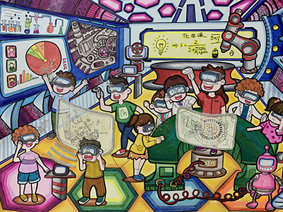 作品创意说明:新冠肺炎疫情席卷全球,作为一名小学生,我时常在思考,未来我们的教室里是不是可以增加关于更多生物化学、更多AI人工智能的学习内容呢?也许这样离人类攻克病毒的一天就越来越近了。我觉得未来教室的四周应该遍布各种电子墙,可以分析当前的温度和湿度,同时电子墙还有阻挡病毒的功能,这样同学们可以一直处于安全的环境内。同学们上课的话都可以使用4D眼镜,电子机器人老师多语种授课,更好地学习知识。这样的未来教室,是不是很有趣呢?