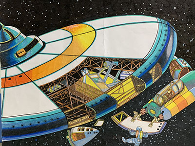 作品创意说明:许多年后,由于环境污染、全球变暖等问题,人类已无法在地球居住,人类一直在外太空探索新的居住星球,可是一直没有结果。于是,全世界的科学家们一起研究制造了一座适合人类居 住的超级太空城,用一种纳米材料做成了"纳米生活万能屏障",可以保护太空城免受外界的破 坏,人们就可以安全居住了 你瞧!科学家和工程师们正在给运送人类从地球去超级太空城的飞船做最后的安装,这艘飞船要 飞行一个月才能到达超级太空城,飞船里面有临时的校园、游乐场、商场、健身馆、餐厅和漂亮