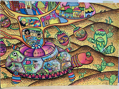 作品创意说明:我国陆地面积中有130万平方公里是沙漠,移动式绿色能源沙漠新居是利用沙漠风能、光能和热能等资源为人类提供移动式的新居。人们可以在这里生活、种植、考古、开发石油等等。