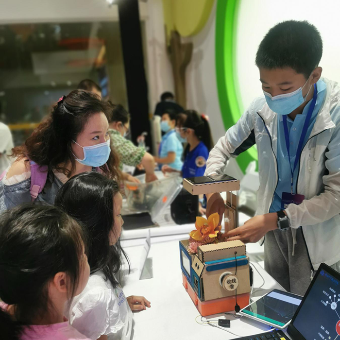 先后在中国宋庆龄青少年科技文化交流中心和中国科学技术馆举办的获奖作品展吸引了许多观众的驻足观看、交流探讨。来自四川绵阳的王博韬、吴凡博带来的《具有人工智能的花盆》获得了发明作品银奖。“通过物联网监控植物长势,实现自动浇水、自动补光,并能够检测到办公桌前养花人是否久坐,提醒起身活动。既帮助人们自动养花,又进行健康管理。”王博韬自信的介绍,吴凡博则实时配合,展示土壤的湿度变化和太阳能板的光照效果。