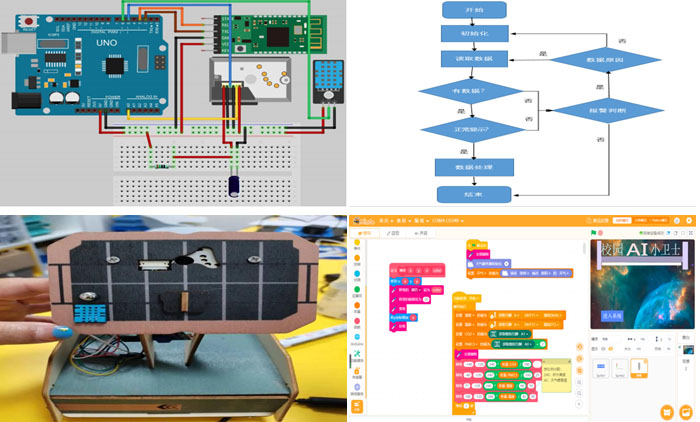 1. 软件系统。线上系统使用Scratch制作,包括智能AI小卫士封面和显示页,显示页包括:二氧化碳数据、温度、湿度、PM2.5。