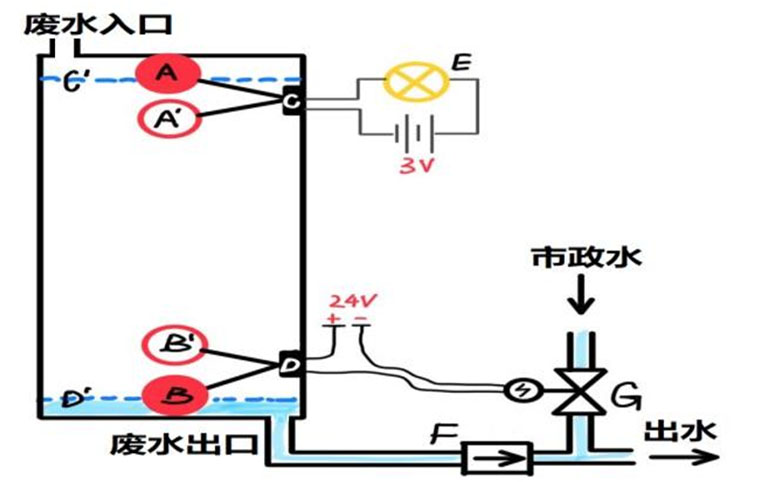 本装置由储水箱,浮球开关,警示灯,干电池,常闭电磁阀,24V电源,电磁阀,单向阀和管路组成。